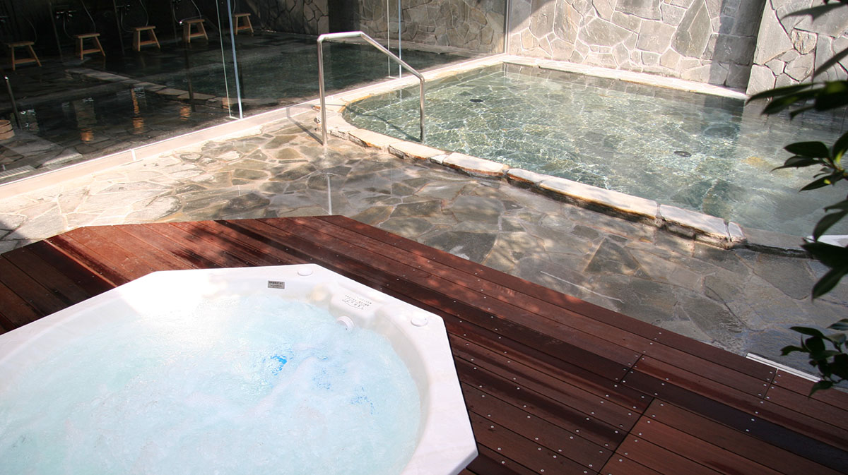 城ケ崎の湯は、カルシウム・ナトリウム-塩化物・硫酸塩泉の天然温泉。透明でほぼ無色、ほんのり塩味を感じるやわらかな湯が特徴です。アルカリ性の高温泉で、体を芯から温めながら、肌をしっとりと整えます。