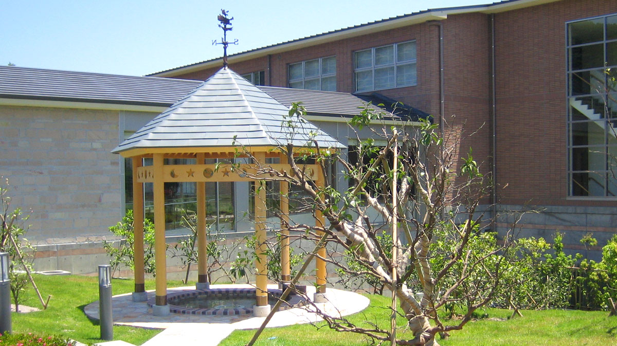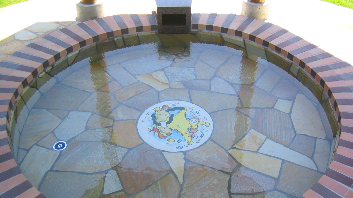 城ケ崎荘のエントランス右側、お庭の一角に設けられた「ユゲとチャップルのゆ」は、宿のシンボル的な存在です。円形の足湯は、中央の底に描かれたマスコットキャラクター「ユゲ」と「チャップル」が来訪者を出迎え、屋根上には風見鶏となったふたりの姿が、さりげなく旅人の目を楽しませます。